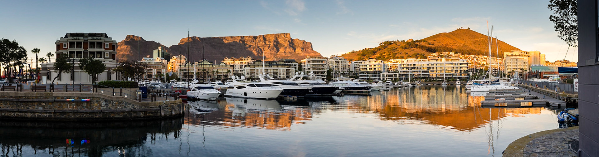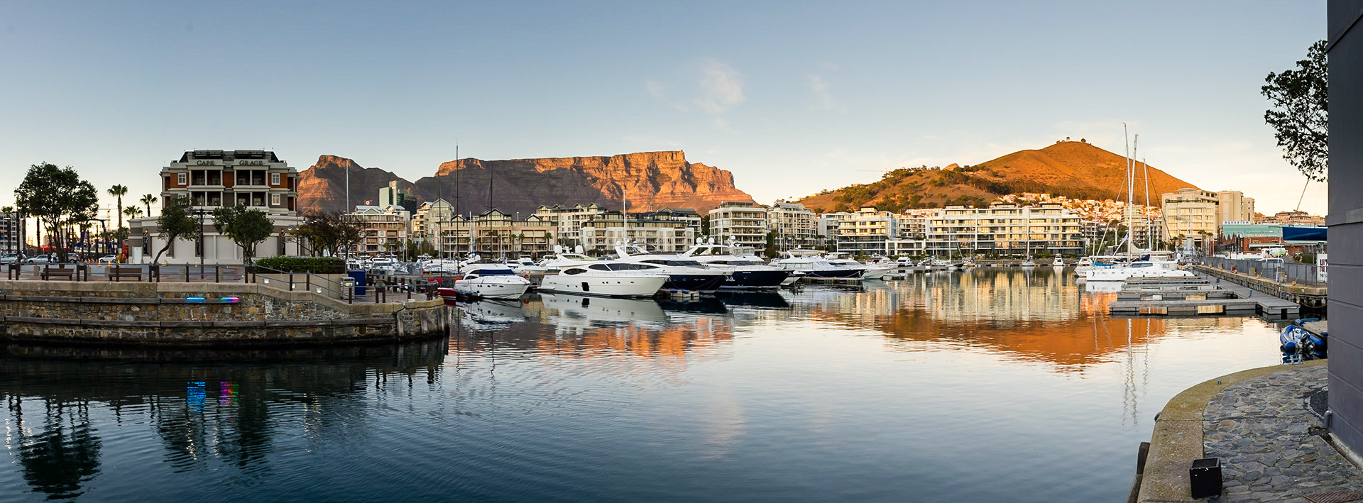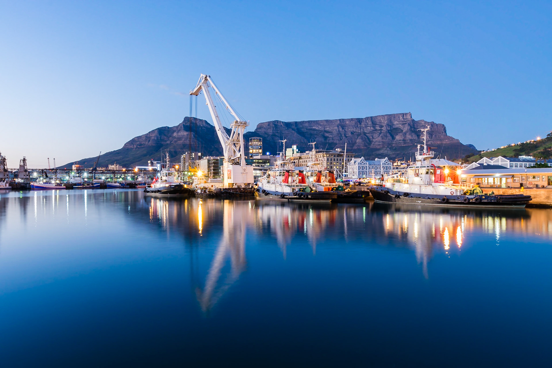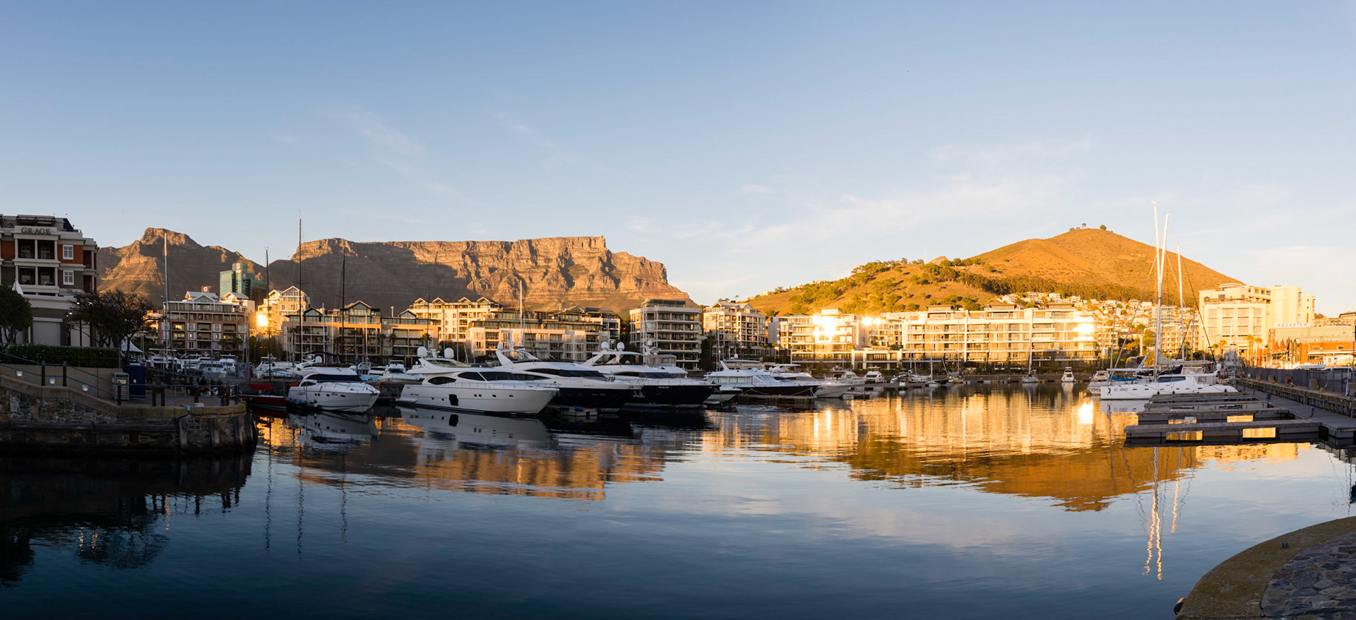 Sunrise at the Victoria and Alfred Waterfront harbour in Cape Town, with Table Mountain in the background.