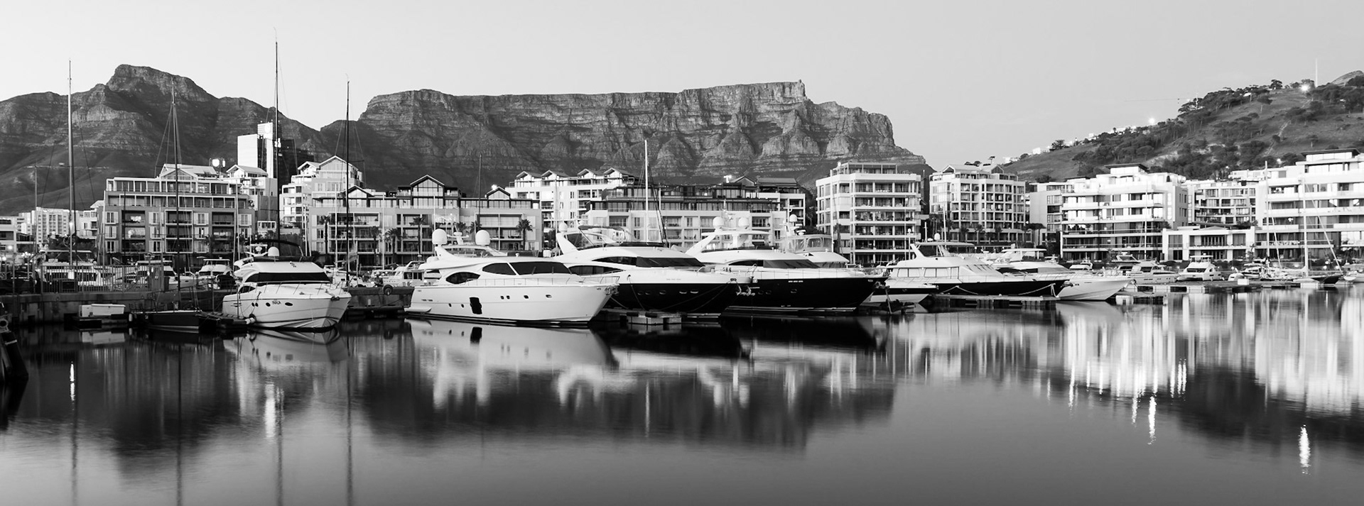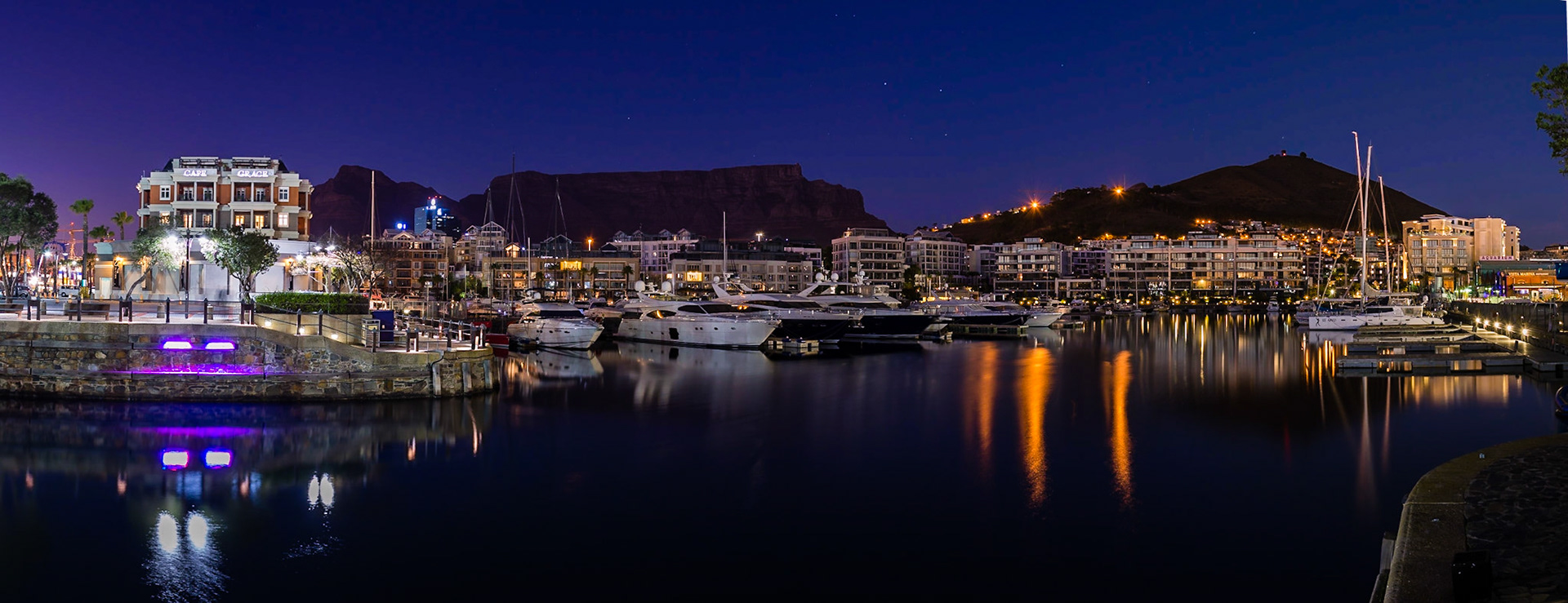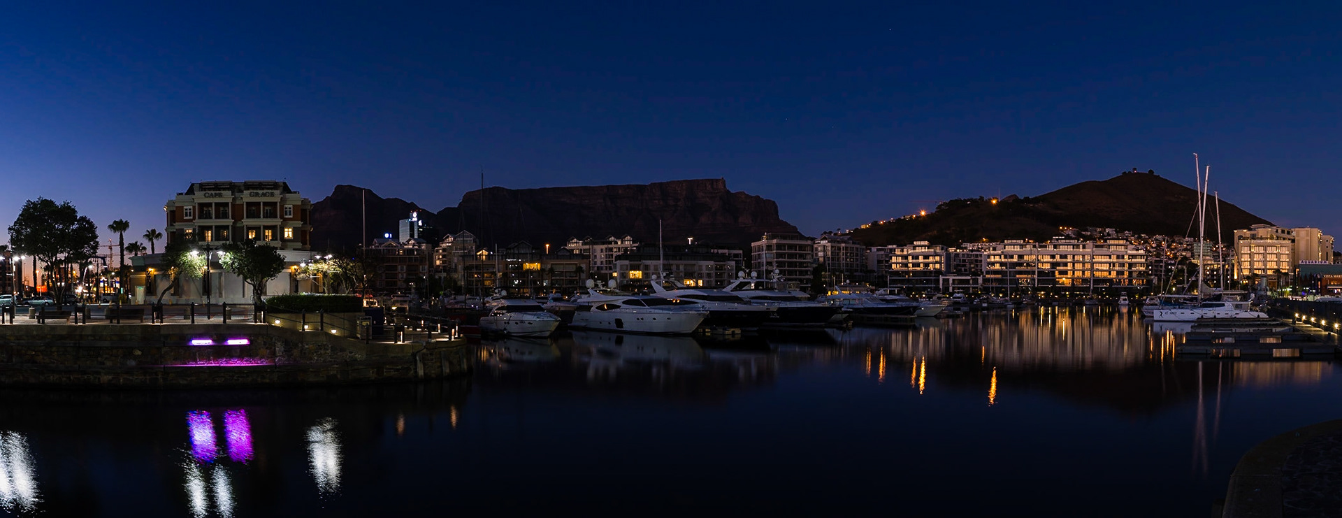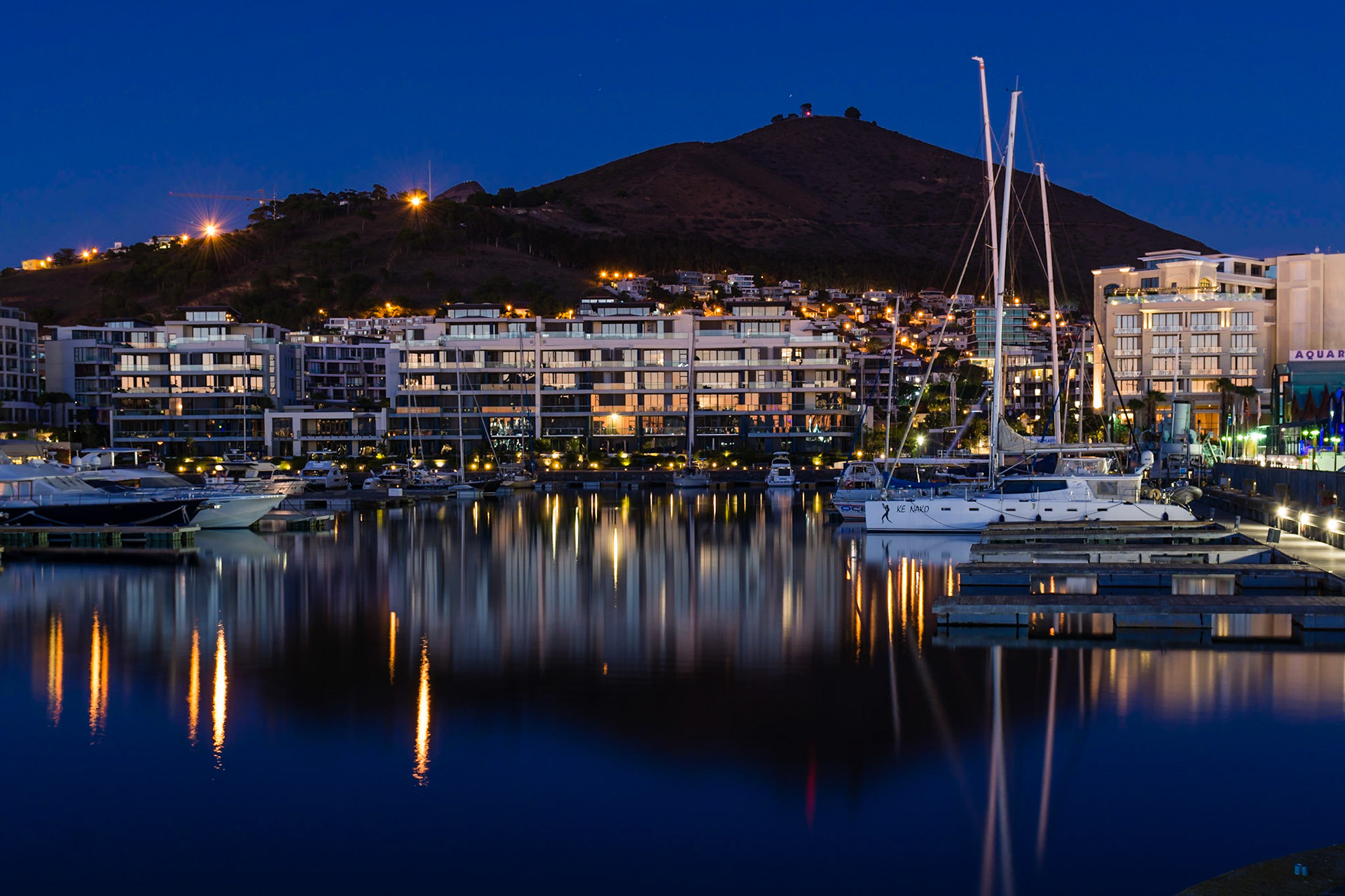 Sunrise at the Victoria and Alfred Waterfront harbour in Cape Town, with Table Mountain in the background.