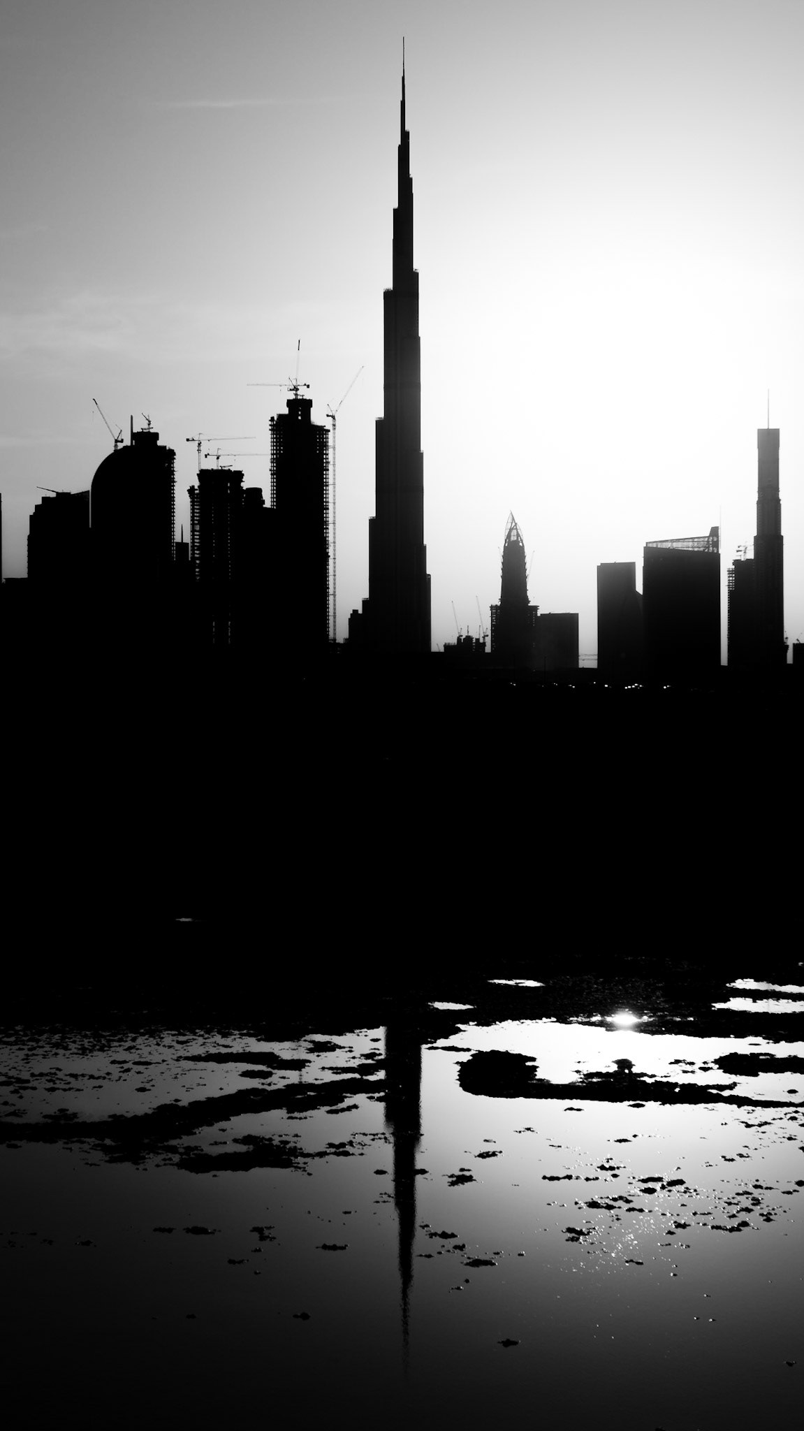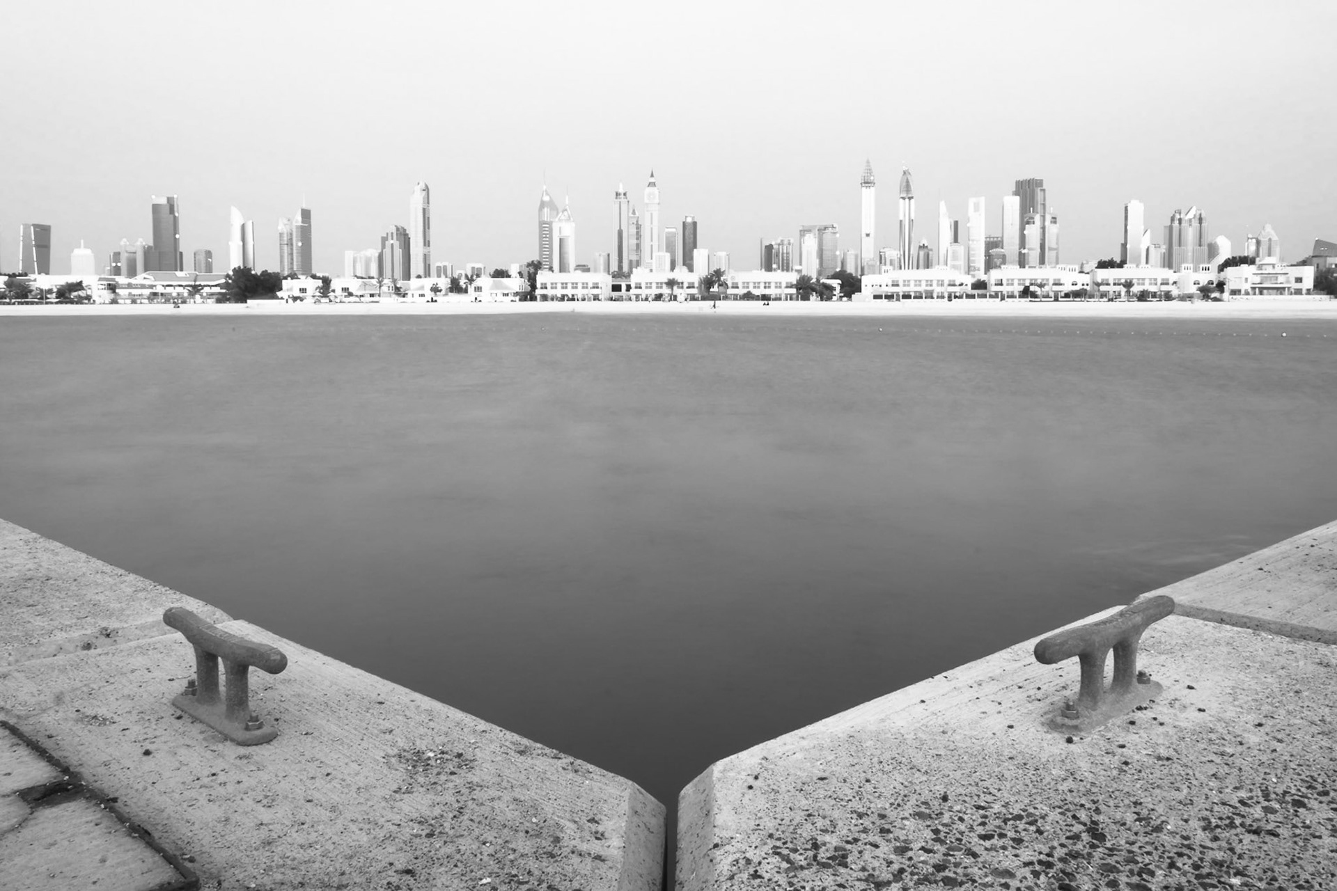 I was returning to Dubai from a nighttime photo shoot and noticed how calm the water was in Business Bay. The actual sunrise was pretty flat and boring, but this panorama was massively improved by conversion to black-and-white.