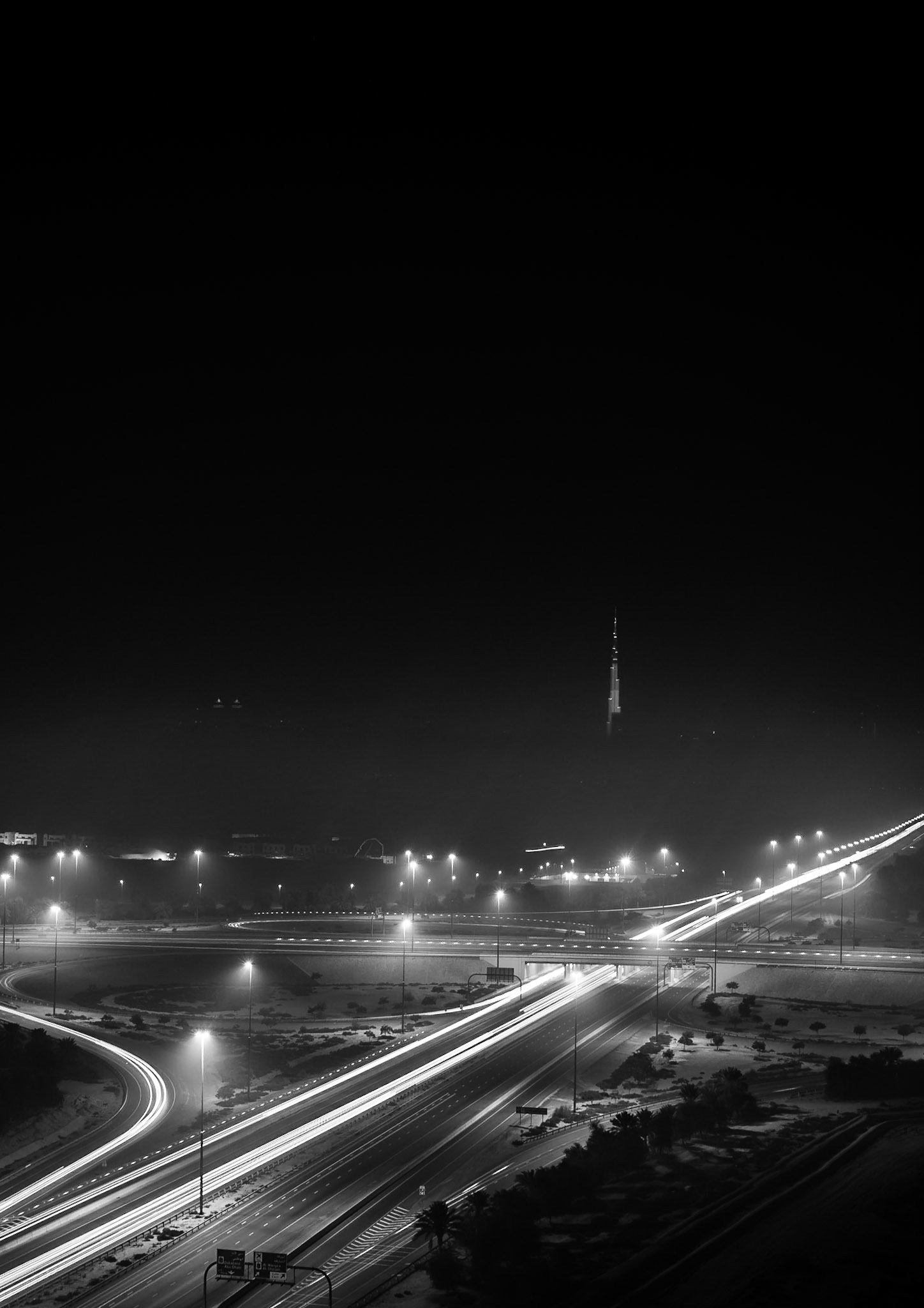 This view of Sheikh Zayed road looks southbound towards Business Bay and the Burj Khalifa.