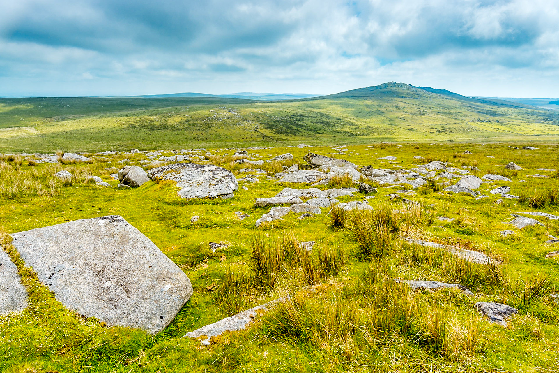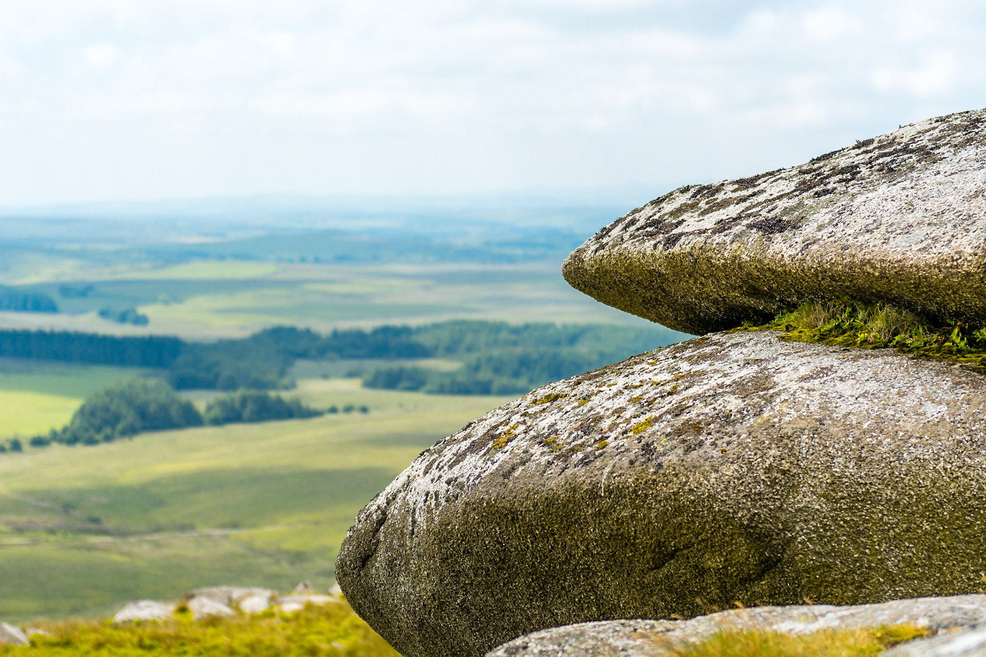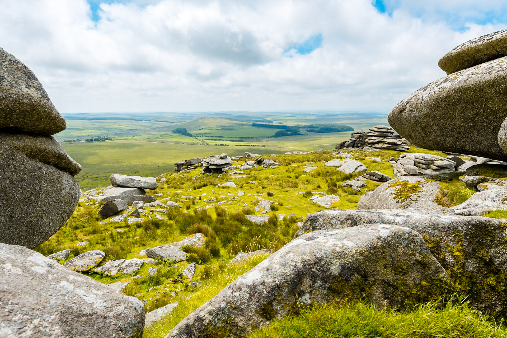 A view of the massive weathered granite blocks that perch on the top of Rough Tor on Bodmin Moor.
