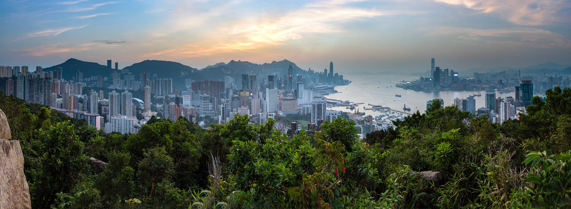 A panoramic view of Hong Kong, captured around sunset from the summit of Braemar Hill.