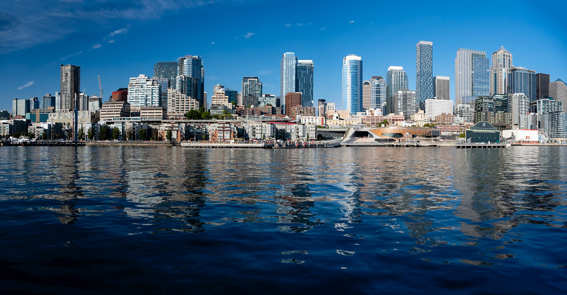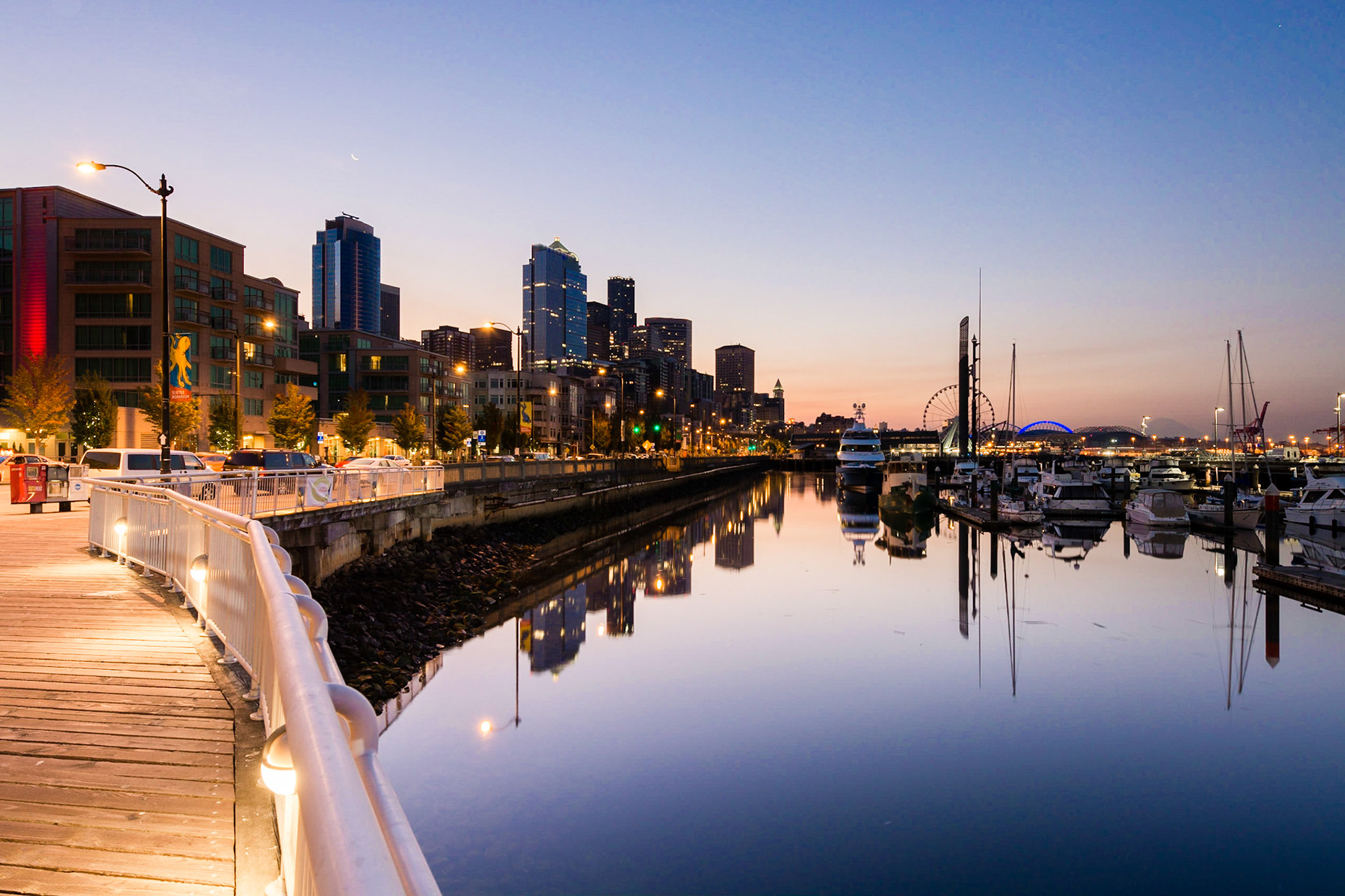 Captured from Seacrest Park in West Seattle, the bay is calm as the city awakes.