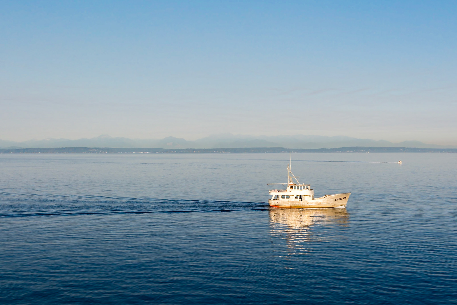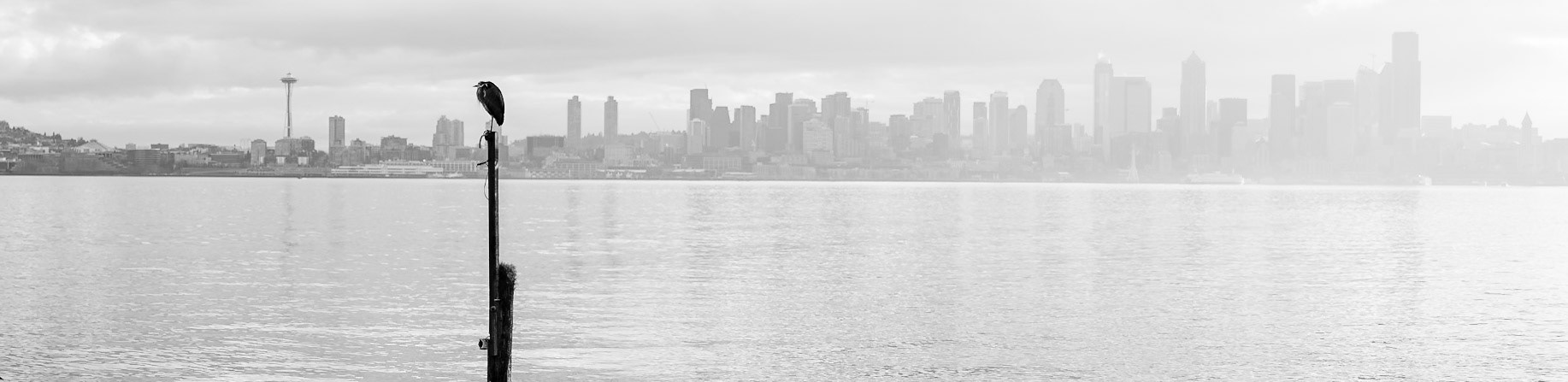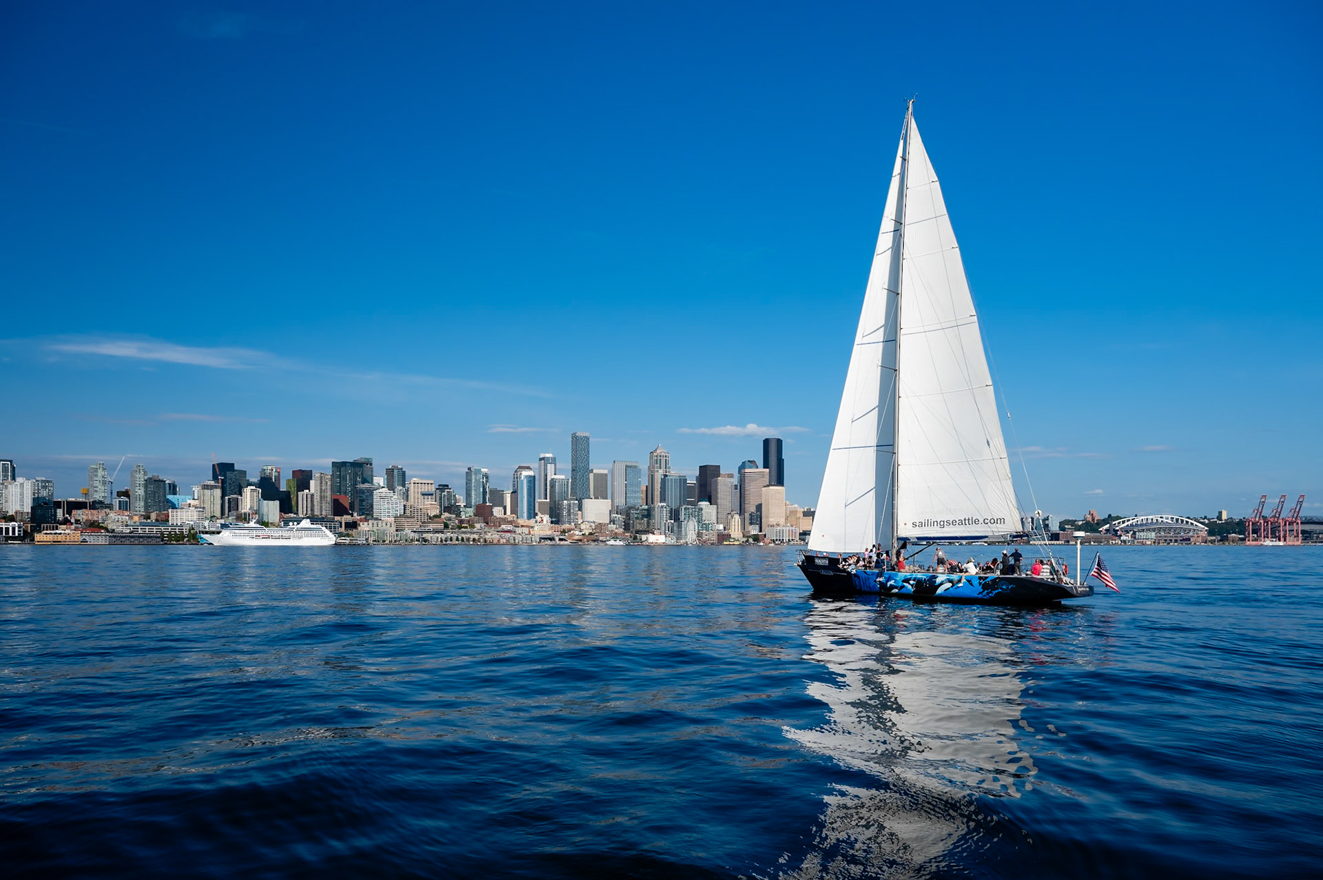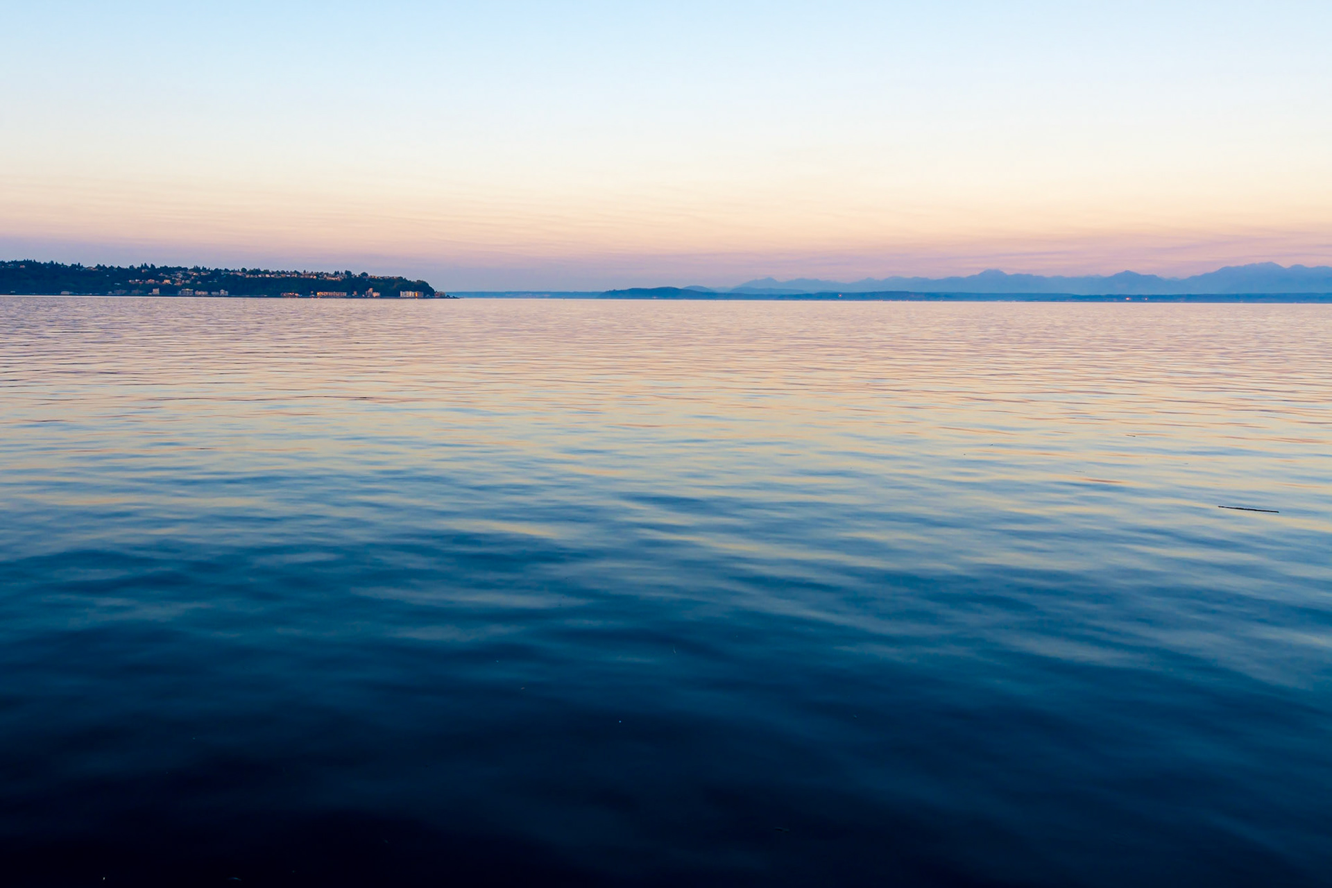 A beautiful day in Seattle- the sky is clear, the sea is calm and this guy has the whole bay to himself.