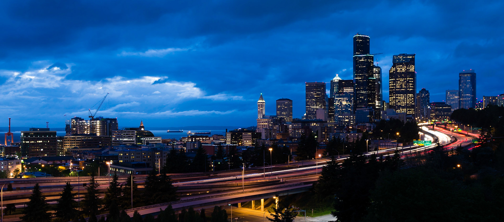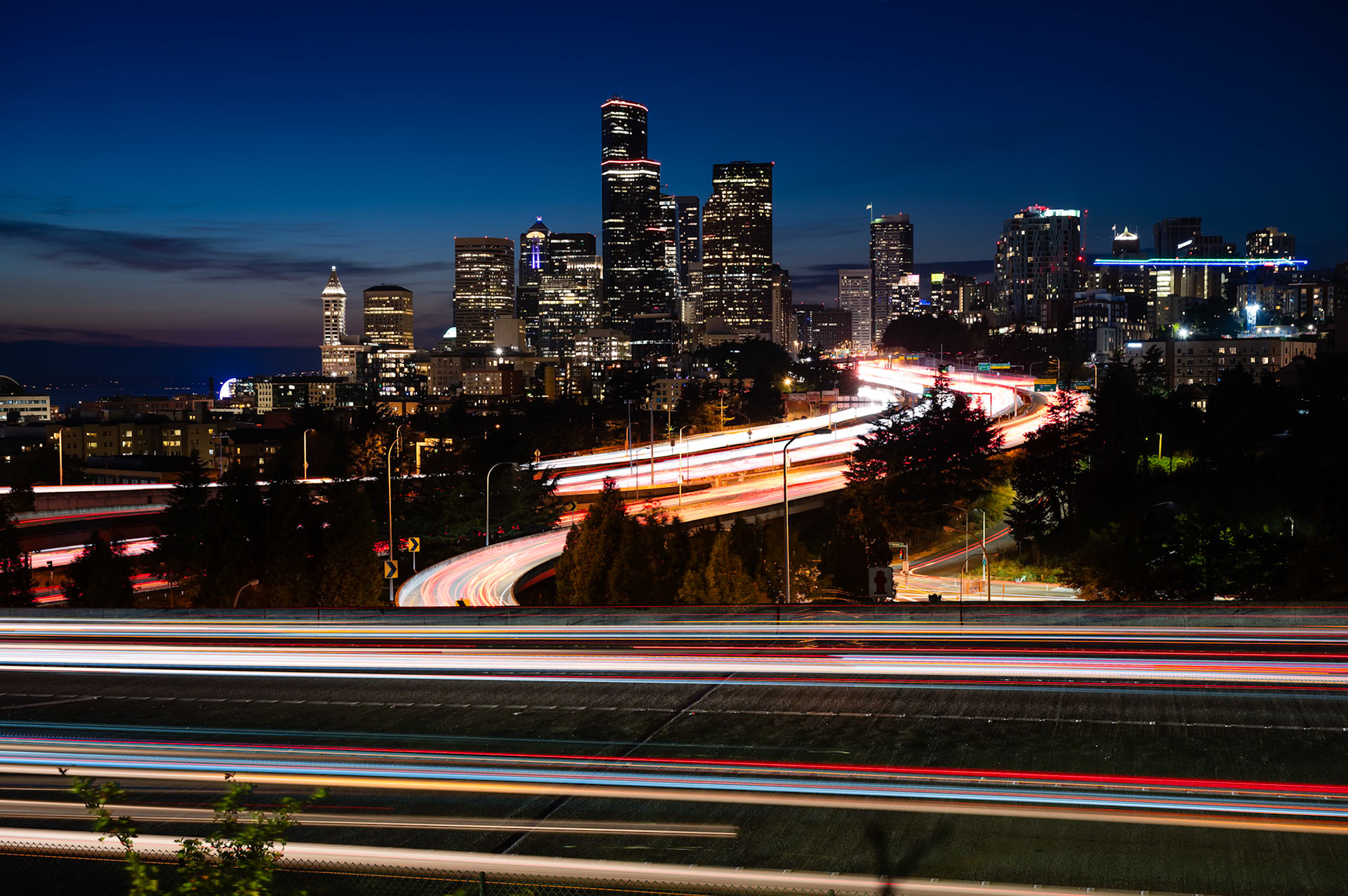 Traffic is busy in Seattle shortly after sunset. This picture is a composite of 5 images.