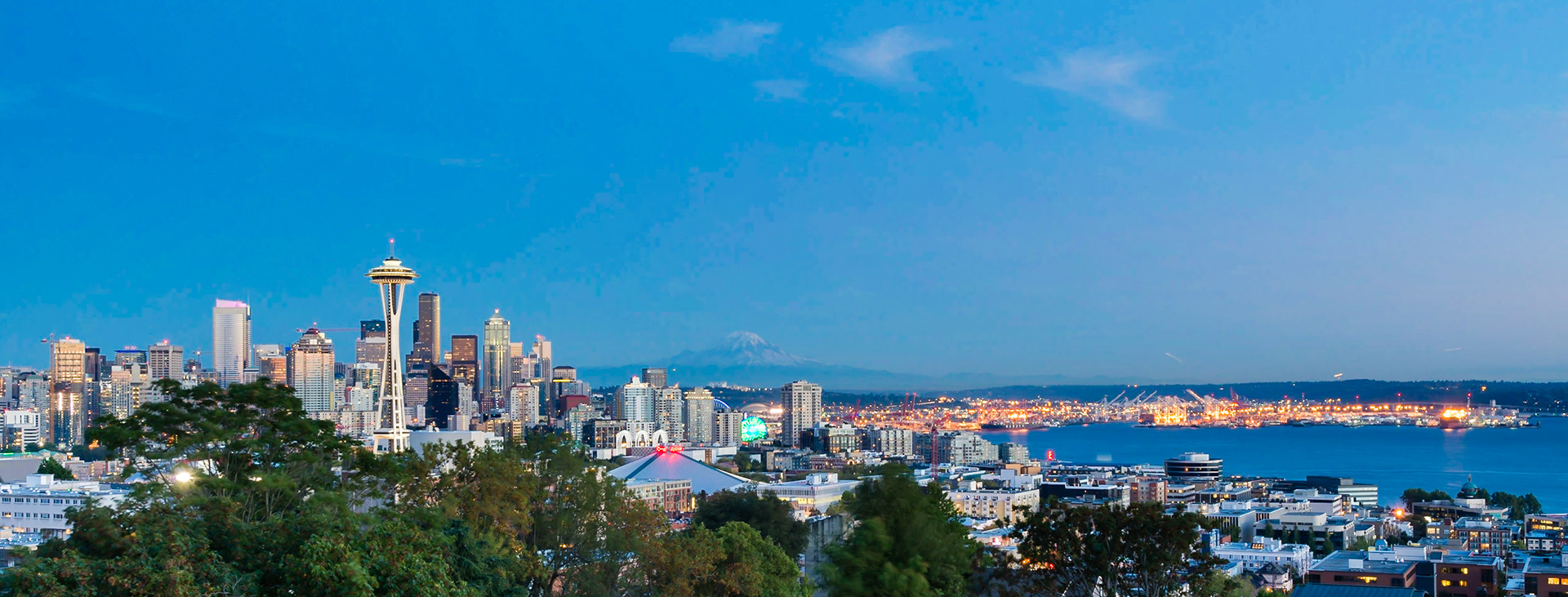 A classic view of Seattle, which includes the city, Space Needle, Elliot Bay and Mount Rainier.