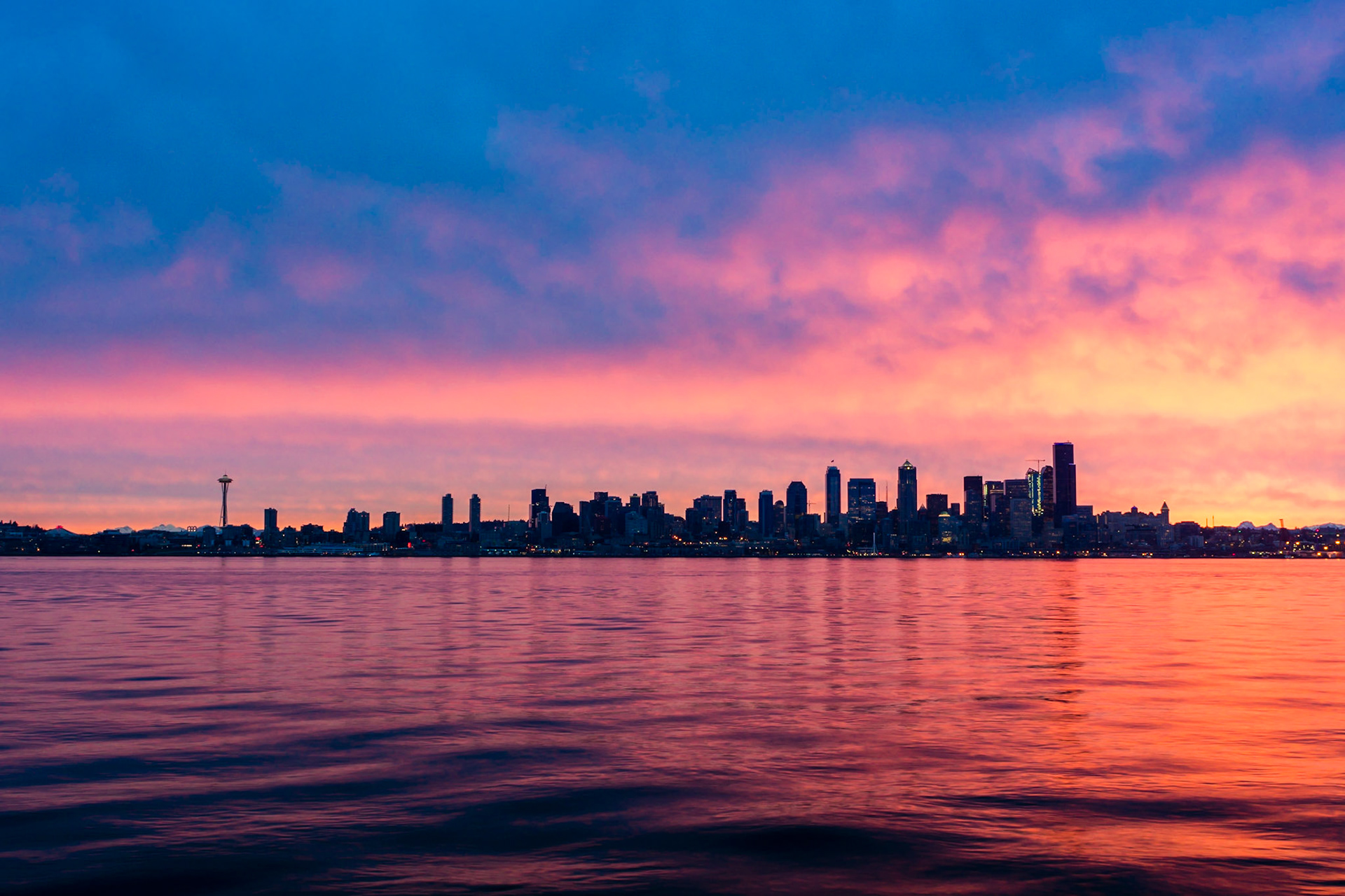 Sunrise in Seattle, Washington State, viewed from Seacrest Park across the bay to Downtown.