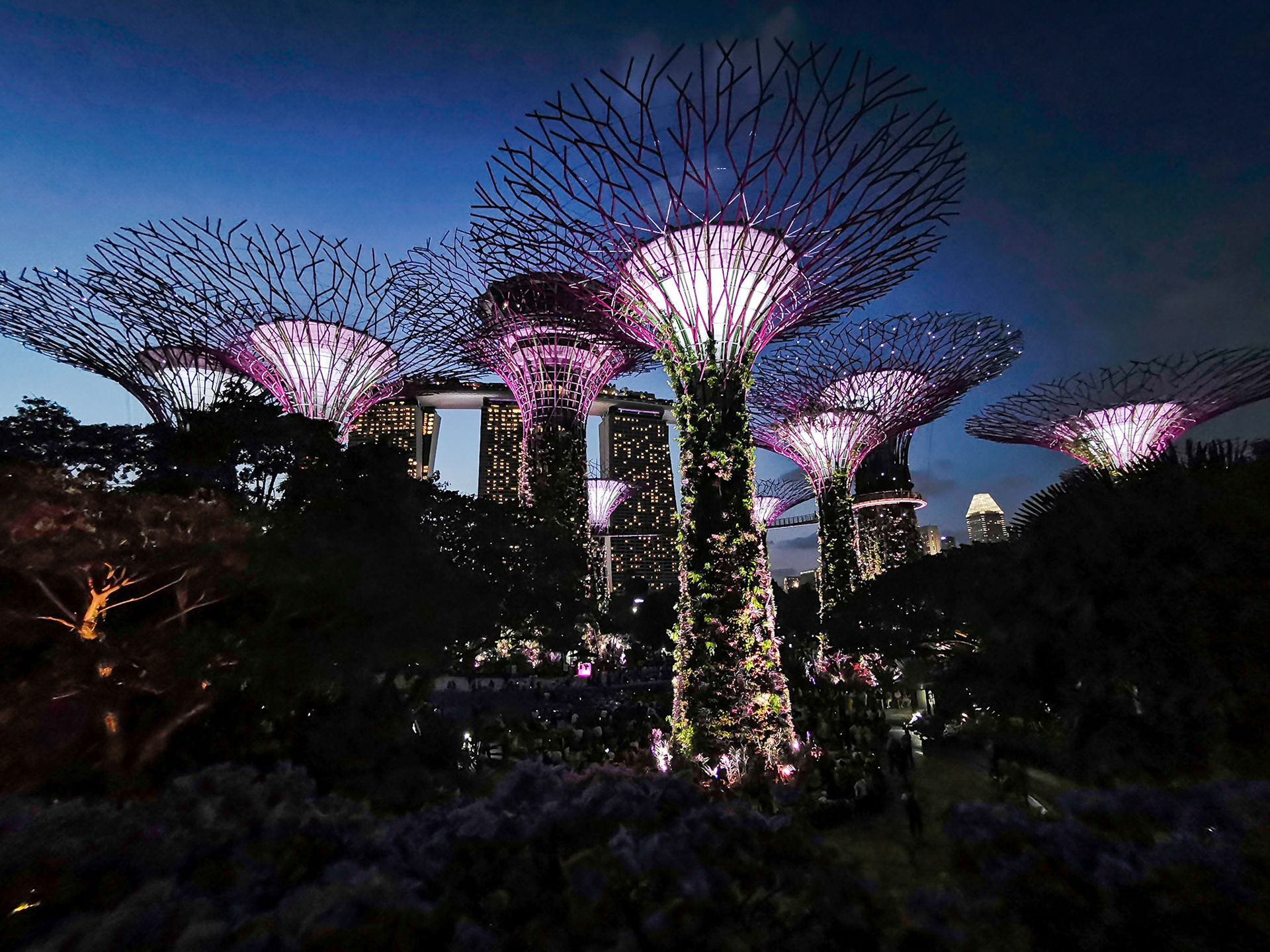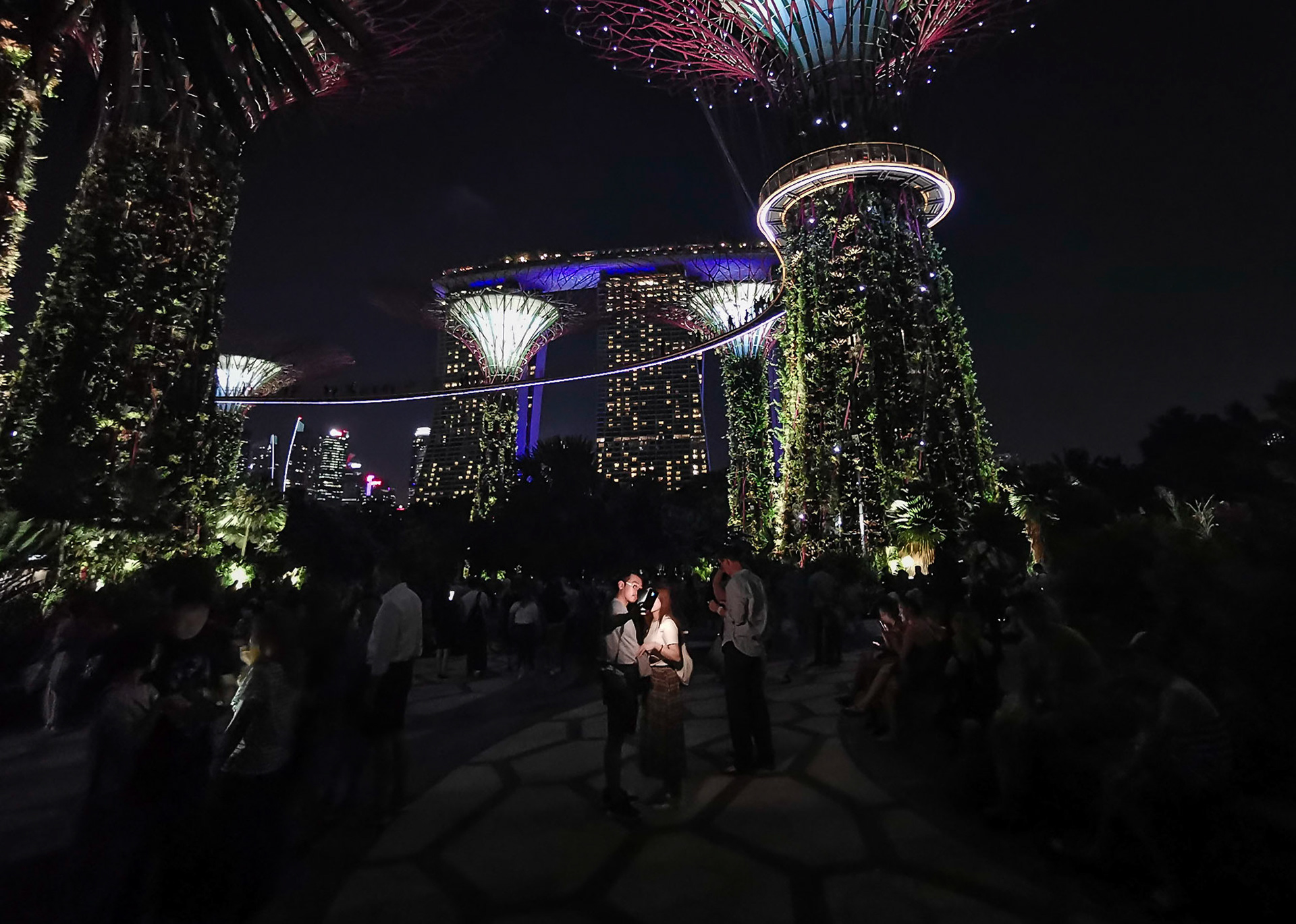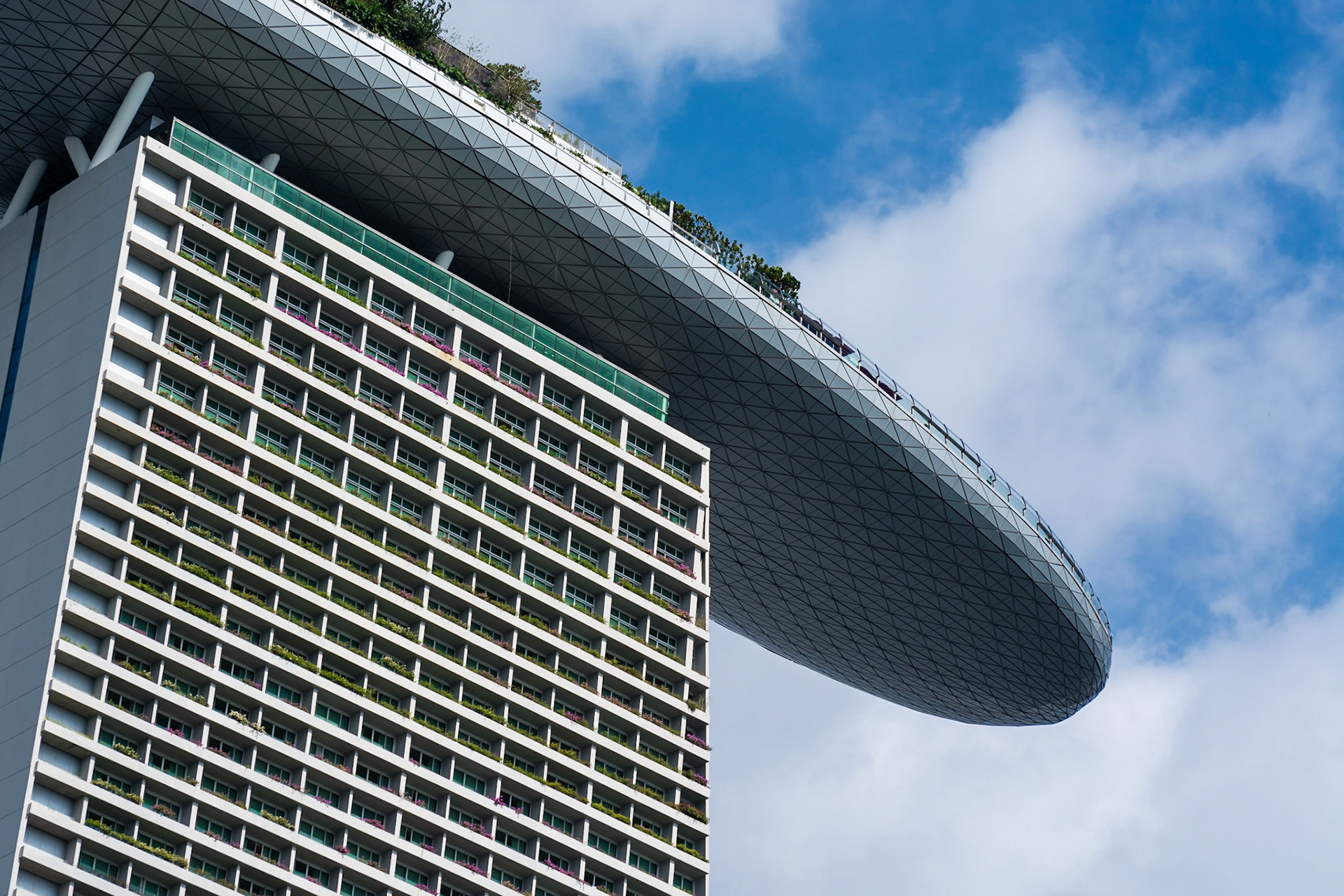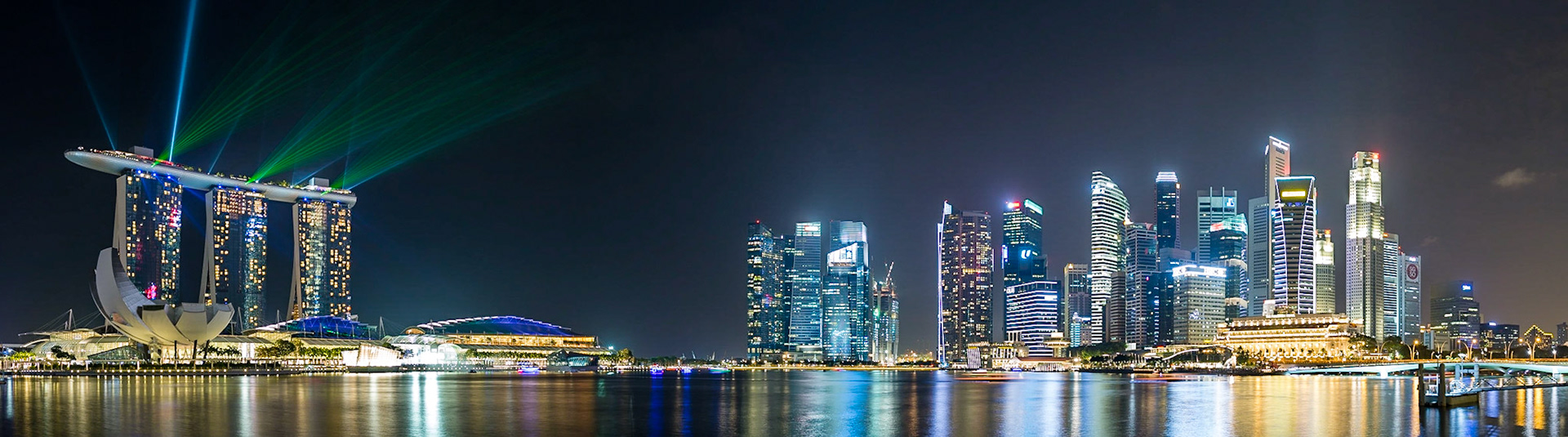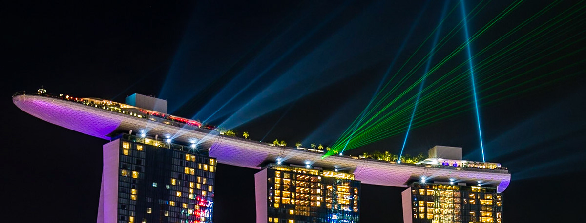 A close-up view of the laser and light show from the Marina Bay Sands towers in Singapore.