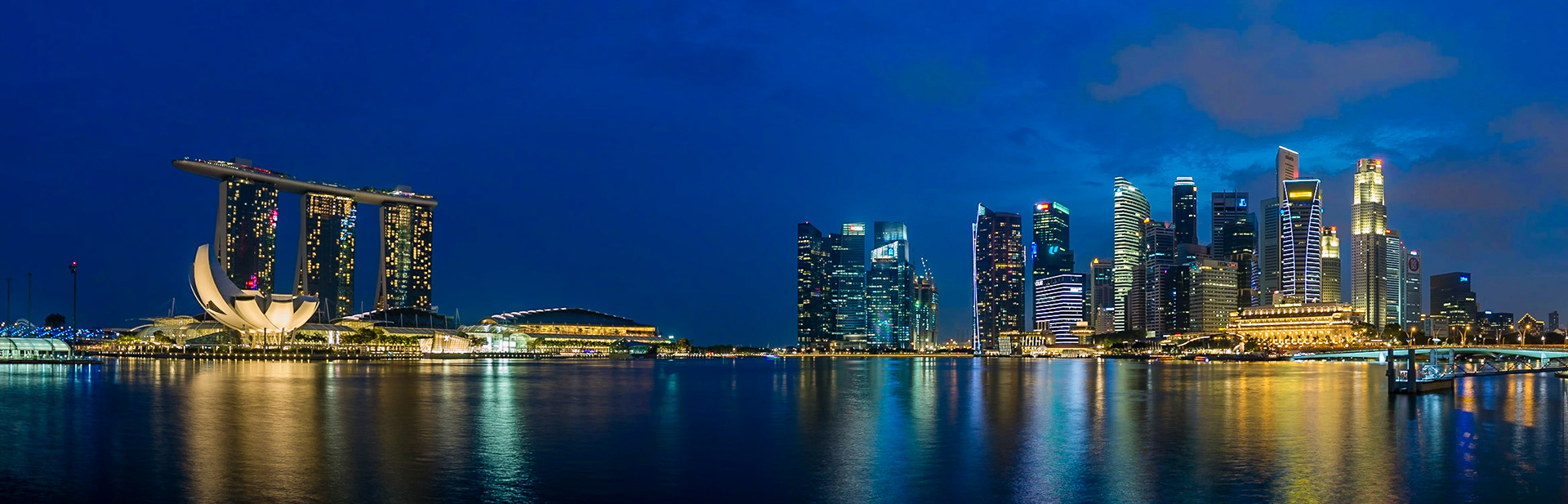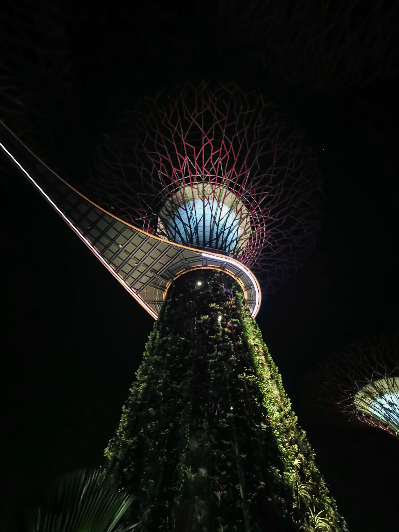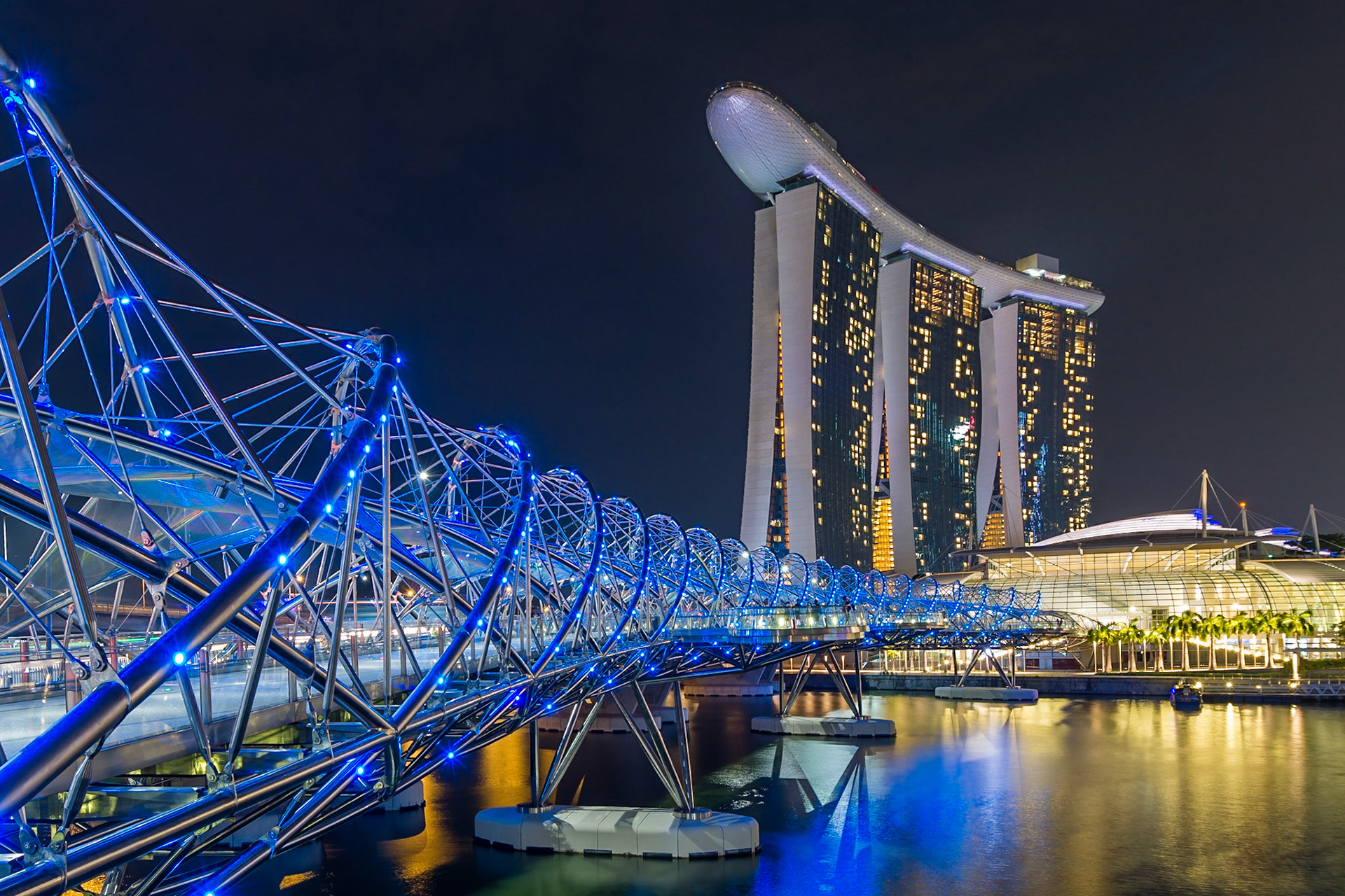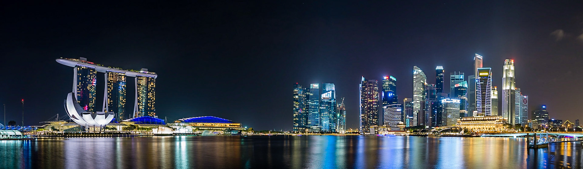 A close-up view of the laser and light show from the Marina Bay Sands towers in Singapore.