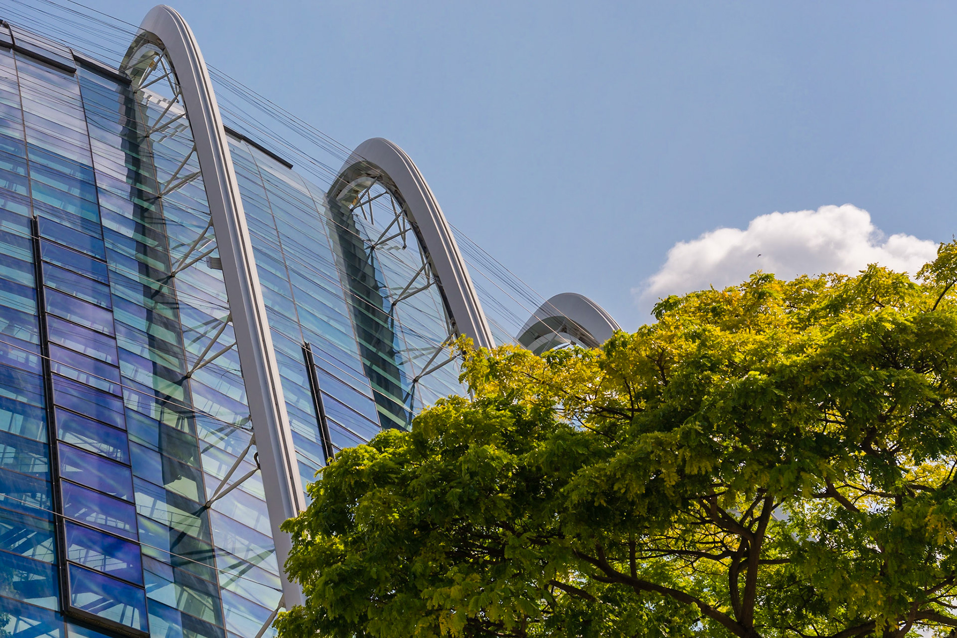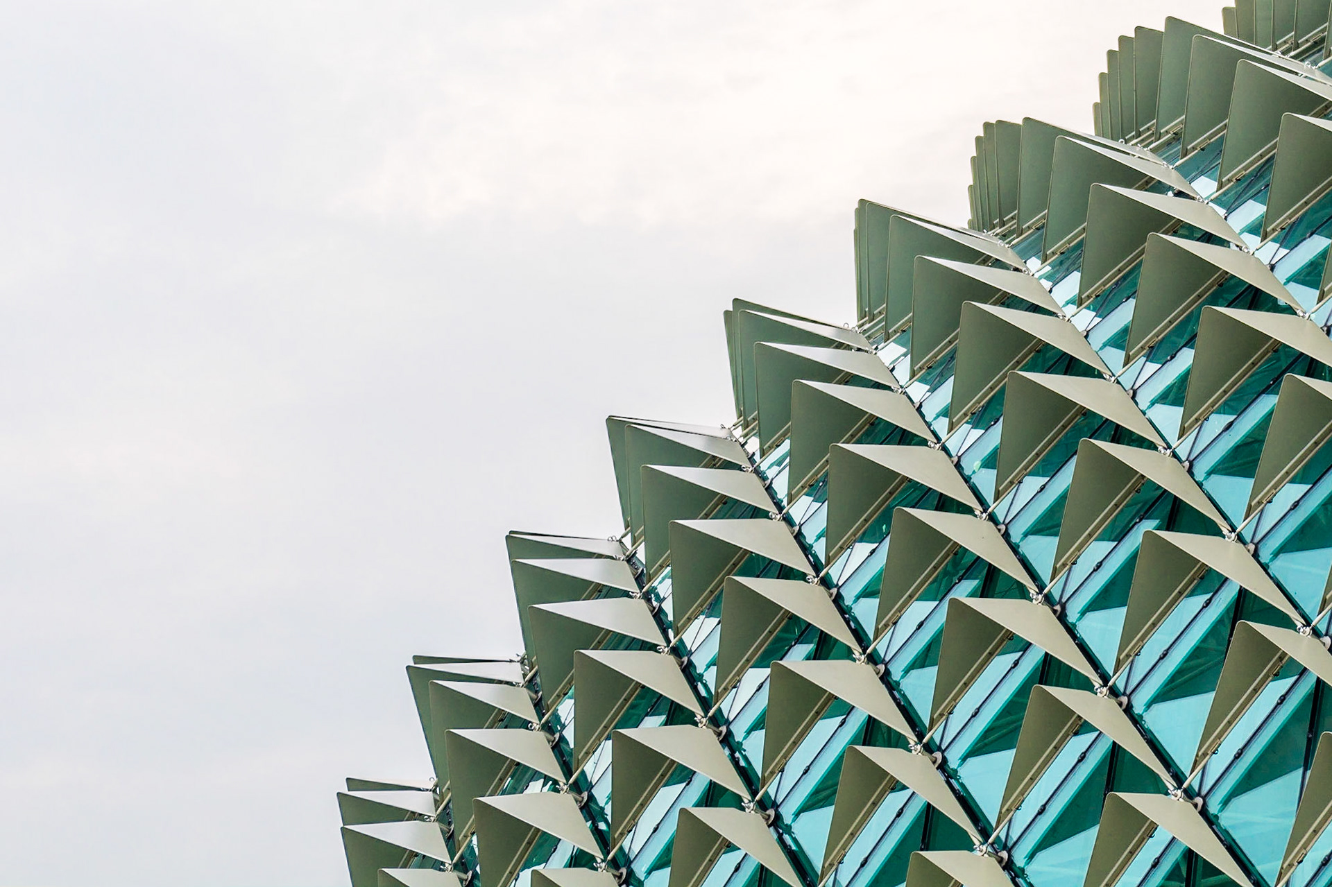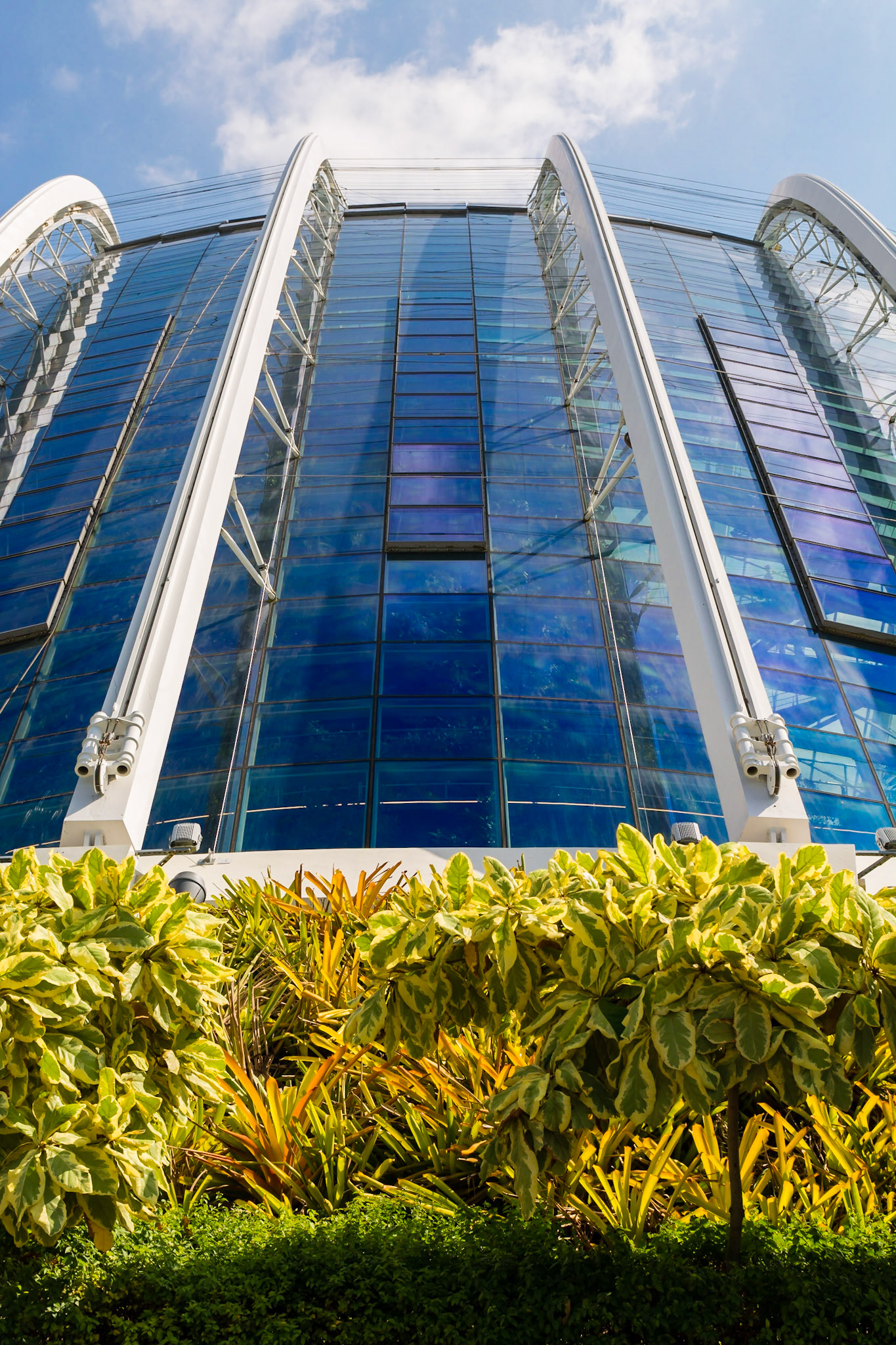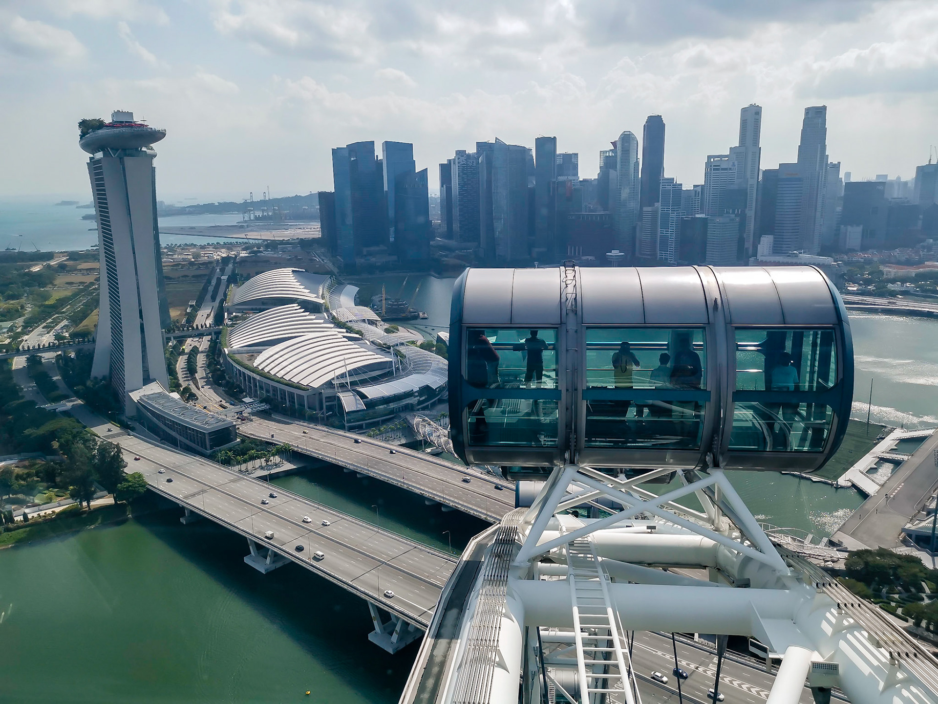 A close-up view of the laser and light show from the Marina Bay Sands towers in Singapore.
